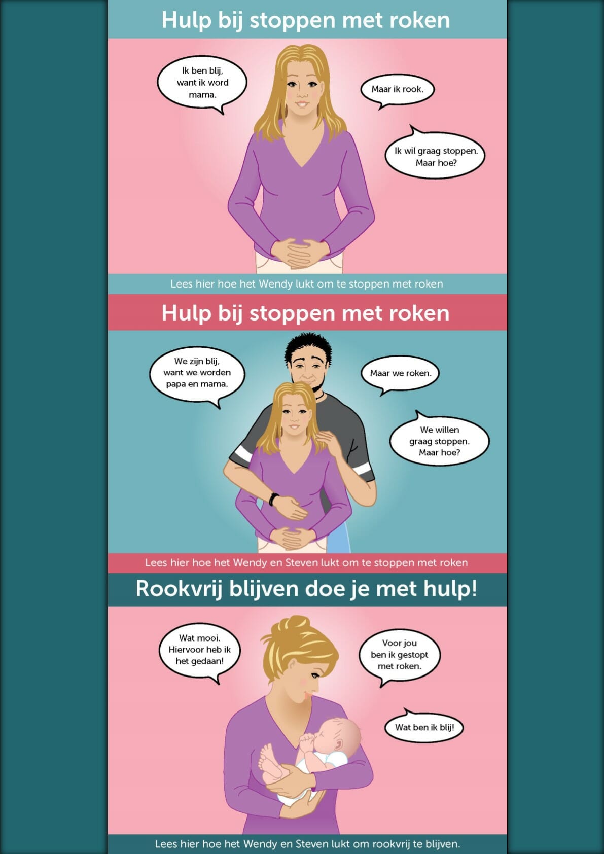 We hebben drie verschillende boekjes. Twee verhalen gaan over stoppen met roken tijdens de zwangerschap: een versie voor alleenstaande vrouwen en een versie voor vrouwen met partner (‘Hulp bij stoppen met roken’). Verder is er ook een verhaal over rookvrij blijven na de zwangerschap (‘Rookvrij blijven doe je met hulp’).