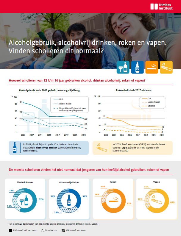 Een belangrijk onderdeel van de NIX18-campagne is het vergoten van de sociale norm rondom niet drinken en niet roken onder de 18 jaar. Maar hoe denken scholieren zelf over deze sociale norm? Hoeveel 12- t/m 16-jarige scholieren vinden het normaal dat leeftijdsgenoten alcohol gebruiken, alcoholvrij drinken, roken of vapen? En hoe verschilt deze norm tussen verschillende groepen scholieren, zoals jongens en meisjes? Deze vragen wordt beantwoord in deze infographic. De data voor deze infographic komen uit het landelijke Peilstationsonderzoek onder scholieren.