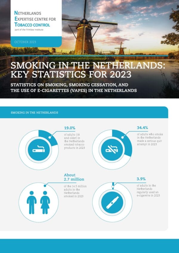 In 2023, 19.0% of adults in the Netherlands smoked, and 3.9% of adults used an e-cigarette regularly. About 1 out of 3 smokers reported having recently made a serious quit attempt in 2023.