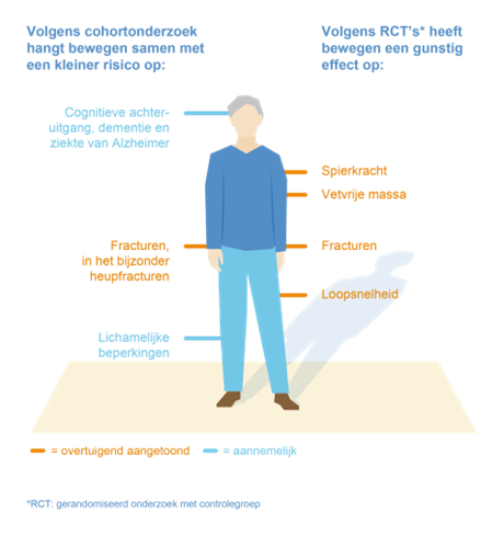 De positieve effecten van bewegen op lichamelijke gezondheid zijn onmiskenbaar aangetoond. Voor volwassenen geldt dat voldoende bewegen de kans op hart- en vaatziekten en diabetes verlaagt. Bewegen hangt ook samen met een lager risico op vroegtijdig overlijden, borst- en darmkanker [1,5].