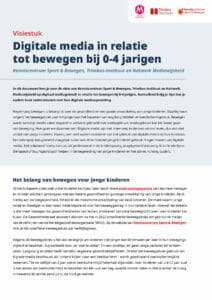 Regelmatig bewegen is belangrijk voor de gezondheid en een goede ontwikkeling van jonge kinderen. Daarbij hoort volgens het beweegadvies voor 0-4 jarigen ook het beperken van langdurig stilzitten en beeldschermgebruik. Bewegen wordt namelijk steeds vaker negatief in verband gebracht met mediagebruik: mediagebruik kan ten koste gaan van beweging. Hoe gaan we daarmee om? Digitale media zijn niet meer weg te denken uit ons leven, dus ook niet uit dat van jonge kinderen. Daarbij zien veel ouders voordelen van het gebruik van digitale media bij hun kinderen. Een belangrijk terugkerend vraagstuk is dan ook óf en hoeveel jonge kinderen gebruik mogen maken van digitale media. Het antwoord hierop kan jou als professional in de kinderopvang, jeugdgezondheidszorg of als kinderfysiotherapeut of buurtsportcoach helpen in de begeleiding van jonge kinderen en het advies richting ouders.