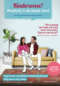 Deze folder kunt u als zorgprofessional meegeven aan mensen die een kinderwens hebben. In deze folder lezen zij dat stoppen met roken de kans vergroot om zwanger te worden. Dit geldt niet alleen voor de vrouw, maar ook voor de man, daarom is deze folder voor hem & haar. In deze folder staan de voordelen van stoppen met roken voor de kinderwens. Ook bevat de folder tips en adviezen om te stoppen met roken en welke hulp je hierbij kan krijgen.
