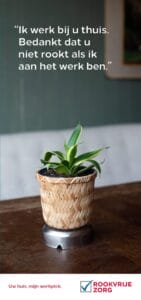 Een gezonde organisatie begint bij een rookvrije organisatie. Medewerkers die bij cliënten thuis werken, worden vaak nog blootgesteld aan tabaksrook. Maak jouw organisatie rookvrij en verspreid de ondersteunende materialen. Een gezonde werkplek is belangrijk. Daarom geldt er sinds 2004 het recht op een rookvrije werkplek. Alleen dit recht geldt niet voor iedereen. Werknemers die bij mensen thuis hun werk uitvoeren, worden nog vaak blootgesteld aan tabaksrook. Met het stappenplan voor zorgorganisaties en aanvullende materialen voor medewerkers en cliënten, kunnen organisaties ervoor zorgen dat medewerkers rookvrij kunnen werken. Maximaal 400 flyers (10 bundels) per klant. Neem voor bestellingen met grotere aantallen (400+) contact op door te mailen naar rookvrijezorg@trimbos.nl.