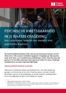 Deze folder is geschikt voor organisaties/ professionals die te maken hebben met cliënten en naasten van mensen met psychische problematiek. Zoals Ggz-instellingen, Herstelacademies, familie-ervaringensdeskundigen, Steunpunten mantelzorg, Steunpunten Ggz, sociale wijkteams en sociaal loket et cetera. De folder bespreekt de cursus ‘omgaan met psychische kwetsbaarheid in de naaste omgeving’; een cursus voor naasten van mensen met een psychische kwetsbaarheid. De folder bevat ook informatie over de train-de-trainer workshop die het Trimbos-instituut aanbiedt aan professionals die deze naasten-cursus willen gaan begeleiden.