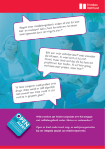 Open en Alert is een programma dat zich richt op het voorkomen van (problemen door) middelengebruik bij cliënten in zorg- en welzijnsorganisaties. Het programma bestaat uit drie pijlers: beleidsontwikkeling, deskundigheidsbevordering en samenwerking met verslavingszorg.