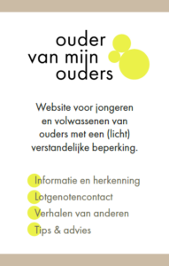 Het visitekaartje wordt gebruikt ter promotie van de website www.oudervanmijnouders.nl. Dit is een website voor jongeren en volwassenen van ouders met een (licht) verstandelijke beperking. www.oudervanmijnouders.nl biedt informatie, herkenning, lotgenotencontact, verhalen van anderen en tips en adviezen.