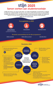 In 2025 ligt de focus voor Stijn op het helpen van onderwijsinstellingen om structureel en integraal te werken aan studentenwelzijn. Dit doen we door kennis, praktische handvatten en samenwerking te bieden die aansluiten bij hun specifieke behoeften. De hier genoemde resultaten zijn slechts een selectie van wat we dit jaar realiseren. Benieuwd wat we vorig jaar hebben gedaan? Bekijk het jaaroverzicht 2024.