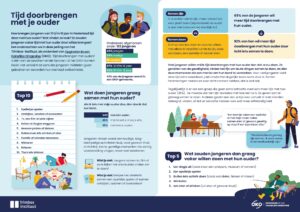 Tijd doorbrengen met ouders is een belangrijke beschermende factor: het draagt bij aan het mentaal welbevinden van jongeren en verkleint de kans op middelengebruik. Daarom is het een van de twaalf factoren binnen de aanpak Opgroeien in een Kansrijke Omgeving (OKO) die gemeenten proberen te versterken. Om beter aan te sluiten bij wat jongeren zelf belangrijk vinden, is in 2025 een peiling uitgevoerd onder 312 jongeren van 10 tot en met 18 jaar. Jongeren is gevraagd hoeveel tijd zij met hun ouders doorbrengen, zowel in het actief samen dingen doen als simpelweg in elkaars nabijheid zijn. Ook is onderzocht hoe zij die tijd graag invullen, of zij behoefte hebben aan meer gezamenlijke tijd en wat zij dan graag zouden doen. Een belangrijke uitkomst is dat veel jongeren het fijn vinden om tijd met hun ouders door te brengen en dit graag vaker zouden willen. Vooral samen actief iets doen, zoals een spelletje spelen, samen eten of een serie kijken, spreekt hen aan. Benieuwd hoe jongeren het liefst tijd doorbrengen met hun ouders? De belangrijkste inzichten zijn samengevat in de infographic. Voor OKO gemeenten is daarnaast een uitgebreide toolkit ontwikkeld om lokaal aan de slag te gaan met de factor Tijd doorbrengen met ouders.