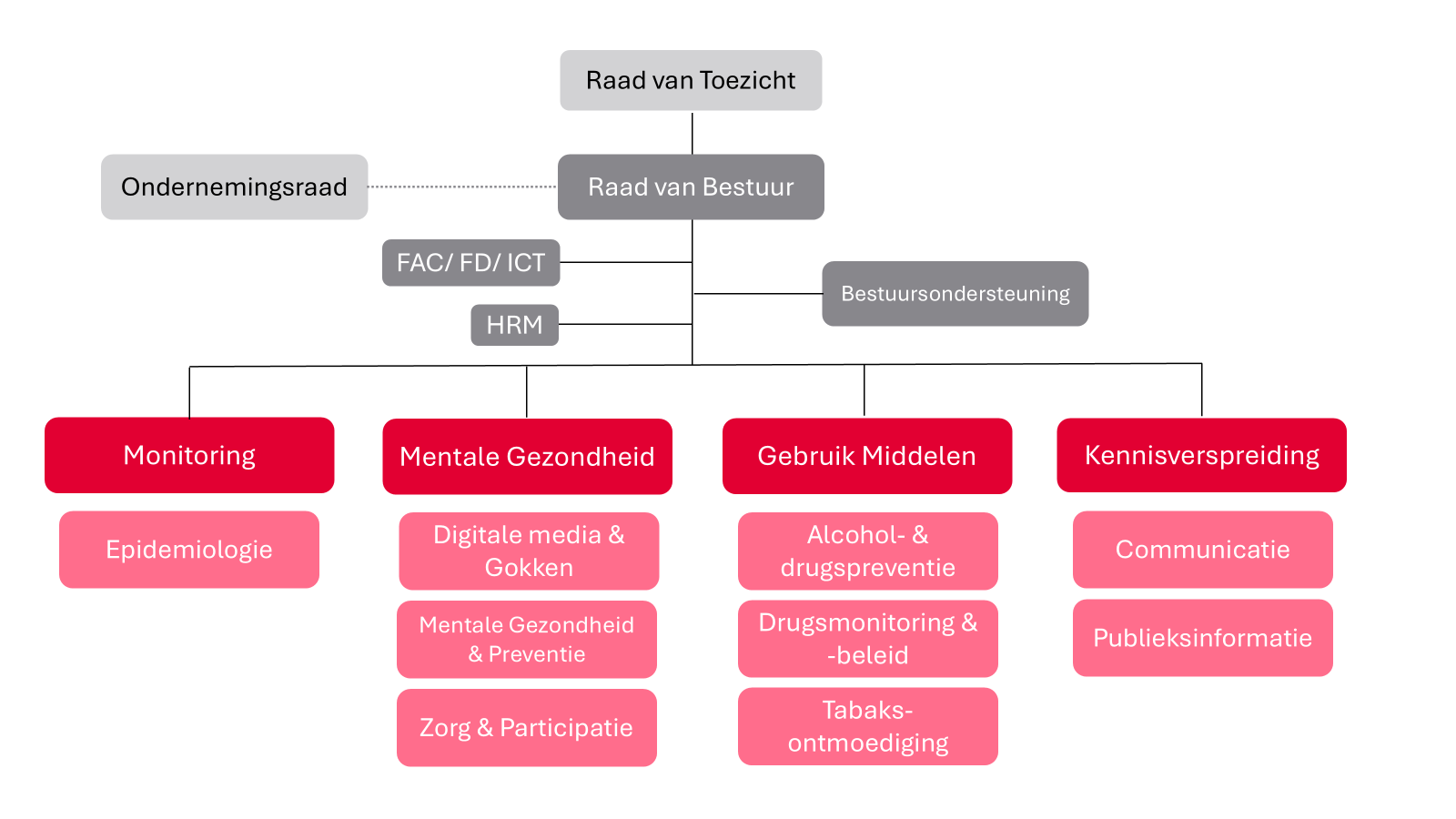 Het Trimbos-instituut is georganiseerd in 9 afdelingen en 4 clusters. Die worden door diensten ondersteund.
